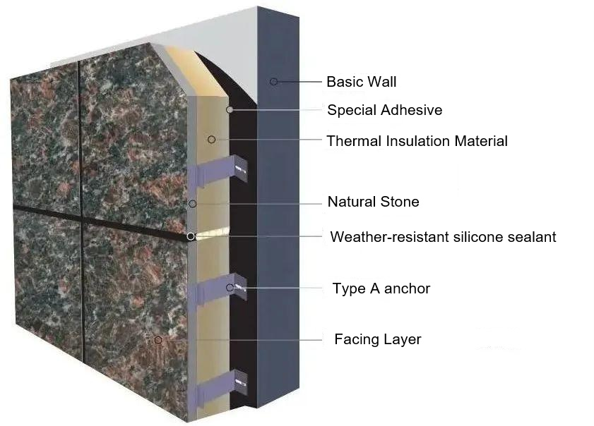 Nka kwerekana hanze yurukuta rwumwenda, imbaho zamabuye zigomba kuba zujuje ibyifuzo byuburanga. Inganda-isanzwe yububiko ifite uburebure buri hagati ya 25-30mm, hamwe na panne-flame yarangije gusaba 3mm yinyongera bitewe nibisabwa byo kuvura hejuru. Agace kamwe kamwe kagarukira munsi ya 1.5m² kugirango wirinde kugoreka kwishyiriraho cyangwa gukwirakwiza impungenge zingana kurwego runini. Kugirango uzamure igihe kirekire, uruhande rwinyuma rwibibaho rugomba gushyirwaho ibikoresho bishingiye kuri silane cyangwa fluorocarubone. Ibi birinda amazi yimvura kwinjira muri micro-pore yamabuye mugihe hagabanywa efflorescence nibibazo bitandukana byamabara - birambuye byongerera igihe cyo gukingira urukuta rwamabuye ubuzima bwimyaka 20.
